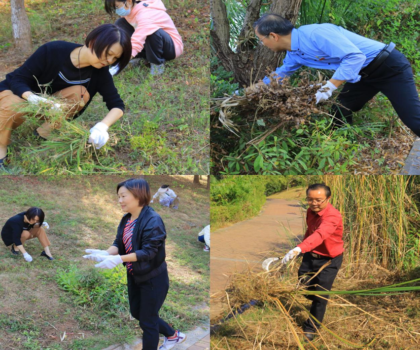 学院党委书记周光明、院长禹旭才、党委副书记刘辉亚与副院长余蓉晖带领十四个党支部书记和2022年下半年入党积极分子培训班的全体学员近400人,积极开展月湖环湖草坪15个区域的绿化带的清理活动,大家齐心协力清除杂草、捡拾垃圾,劳动场面如火如荼。