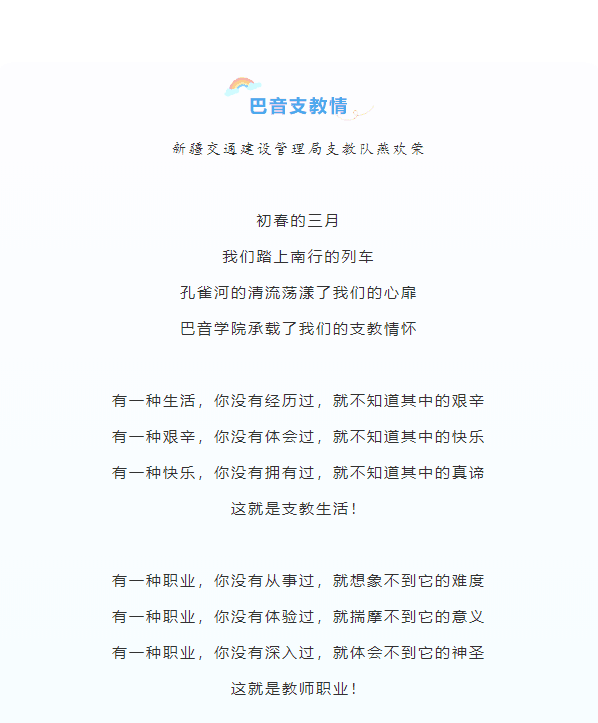上一条: “多措并举,打造创业新平台”---公共教育学院职业指导部开展赴开发区、库尔勒市双创孵化基地考察交流活动