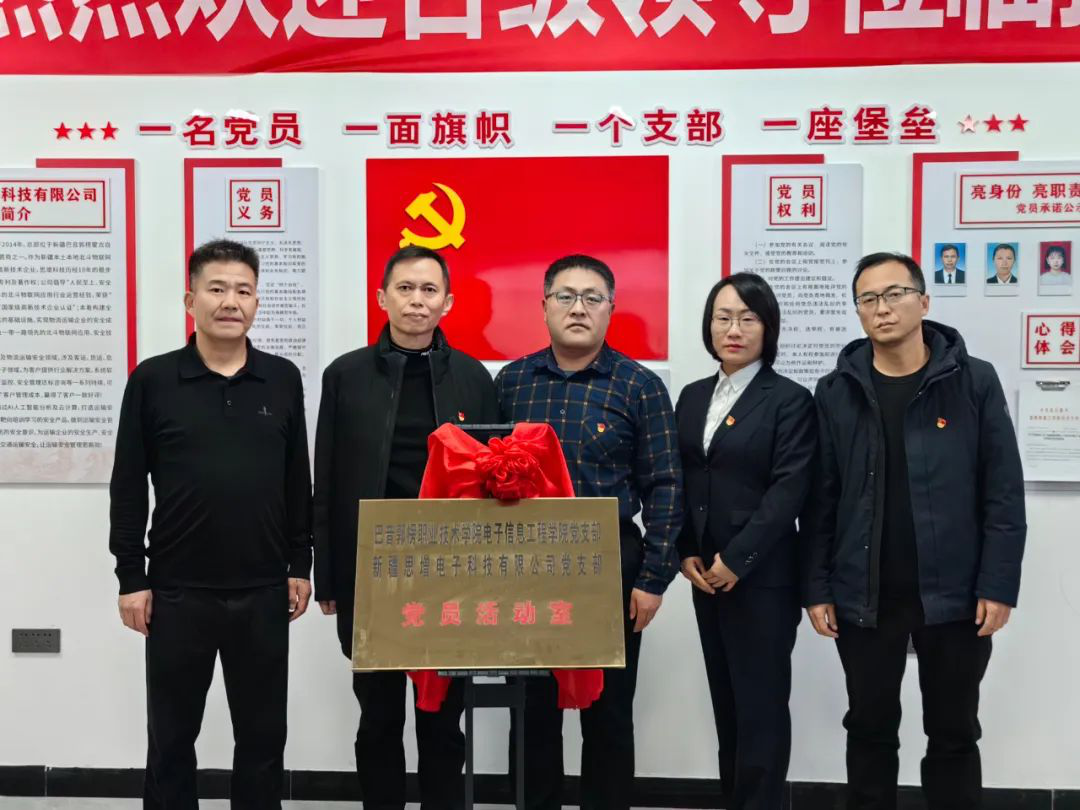 本次活动聚焦党建与产学研深度融合,致力于发挥党组织引领作用,推动电子信息领域科技研发、人才培养和产业升级,实现高校与企业资源共享、优势互补。活动期间,双方共同为“电子信息工程学院党支部与新疆思增电子科技有限公司党支部活动室”揭牌,标志着双方合作进入新阶段,为后续产学研协同创新筑牢根基。