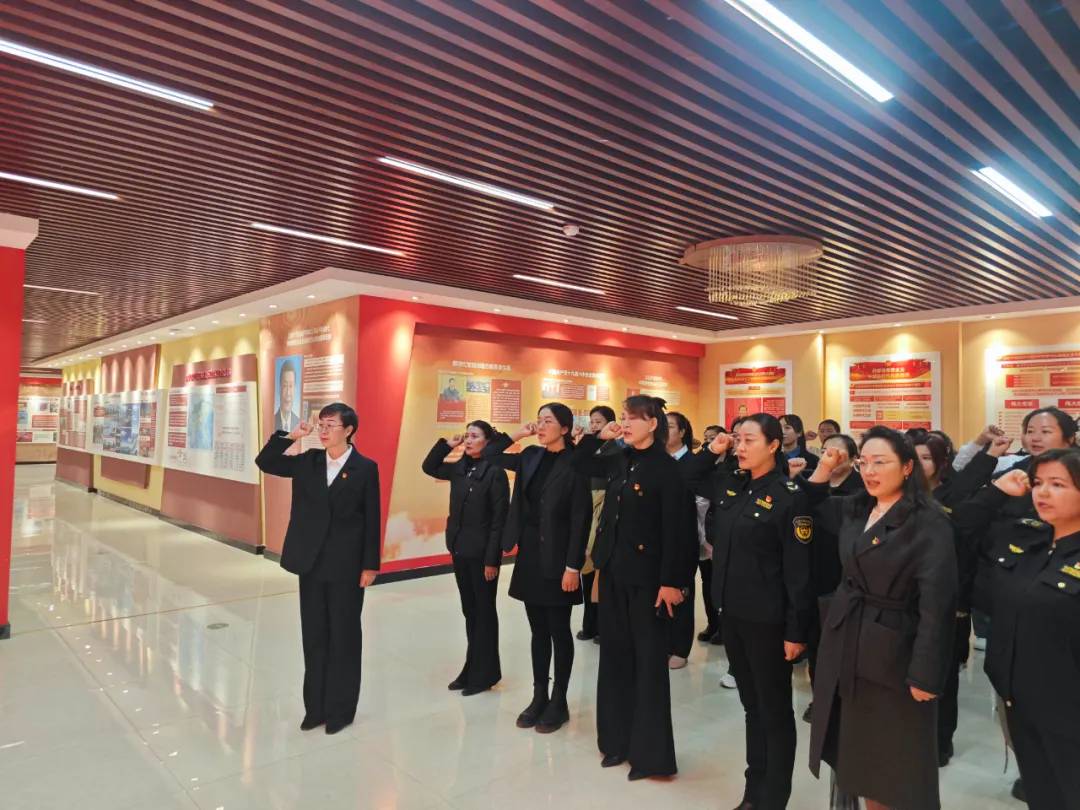 图为:全体党员干部重温入党誓词