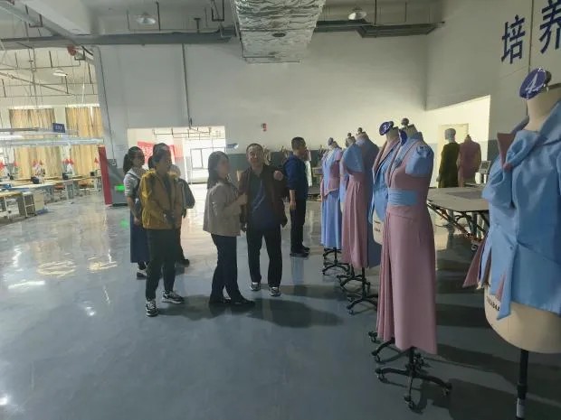 随后,中国纺织出版社一行前往纺织服装学院,参观了产教融合实训基地,深入了解产教融合、校企合作的育人模式,以及纺织服装行业的生产流程和技能要求。此外,还参观了特色工作室和服装生产企业,对服装设计和生产制造有了更直观的认识和了解。
