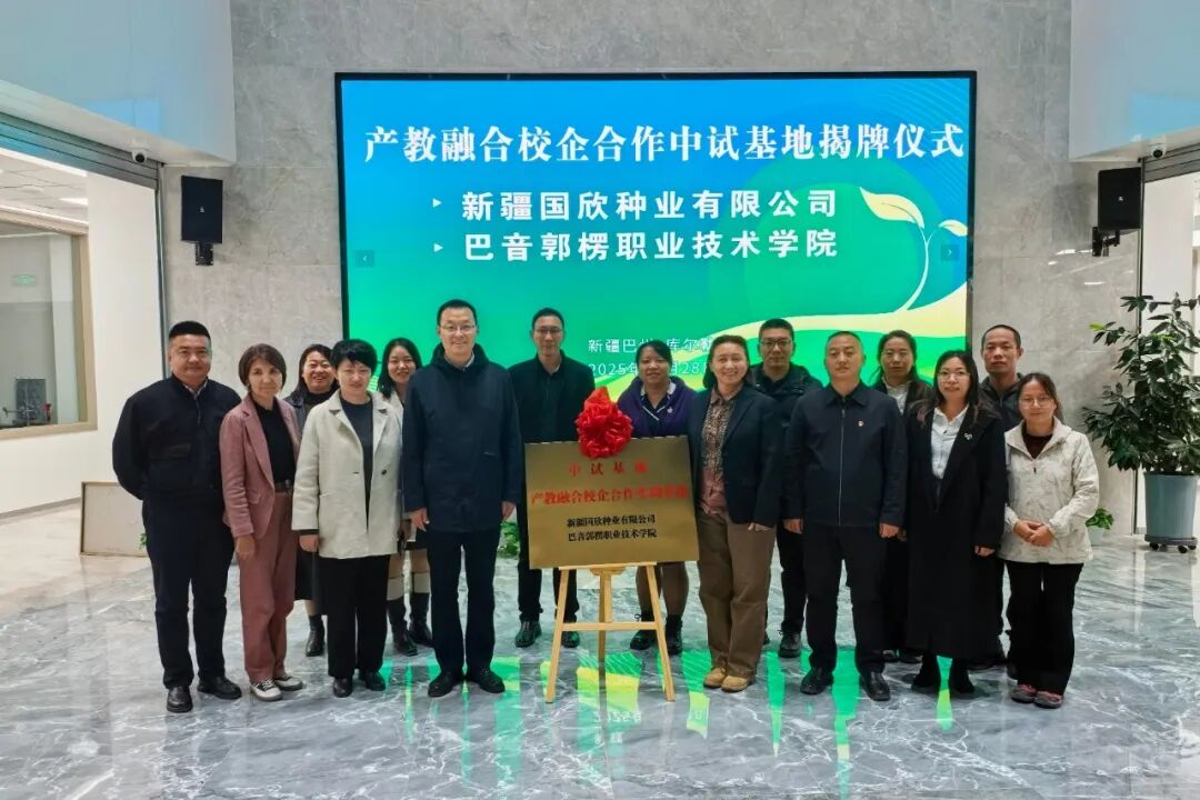 在新疆国欣种业有限公司,调研组一行了解了企业发展和行业共同体建设情况,巴州农业农村局党组成员、农广校校长王迎风、国欣种业副总经理顾虹、PP电子游戏网站党委副书记、院长高志涛等代表行业主管部门、企业、学校举行了“中试基地暨产教融合校企合作实训基地”揭牌仪式。