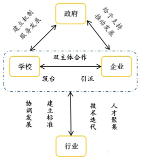 校企合作是提升职业院校办学水平和职业教育质量的重要途径。合作内容主要包括人才共育、师资培训、企业员工进修培训、联合办学、项目开发、产品研发、技术改造、科技攻关和科技创新等所有形式和类型的合作[19]。合作的目的是提高学生的综合能力和就业竞争力,培养技能型专门人才。从合作主体来看,其主体是多元的,既包括学校、企业,也包括政府、行业和社会。