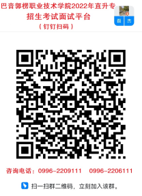 请参加巴音郭楞职业技术学院2022年直升专招生考试的同学,按照规定时间提交《2022年优秀中职毕业生直升高职(专科)申请表》、印证材料和公示材料,并于4月10日12时前完成报名。报名结束后请于4月10日18时前扫描下方二维码,填写相关信息,申请提交加入"PP电子游戏网站2022年直升专-招生考试面试平台",我院将对考生身份核实,并进行考试分组,考生因个人原因未申请进入钉钉考试平台,没有进行直升专线上面试,视同缺考。