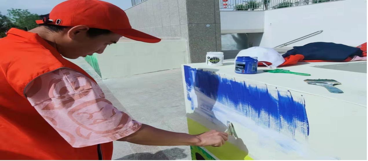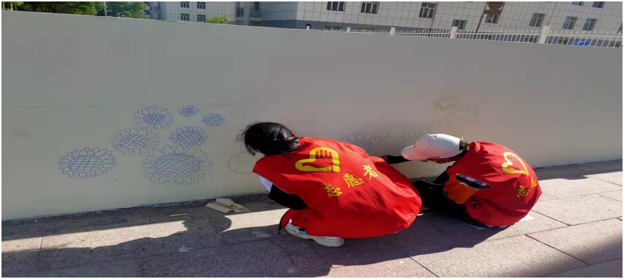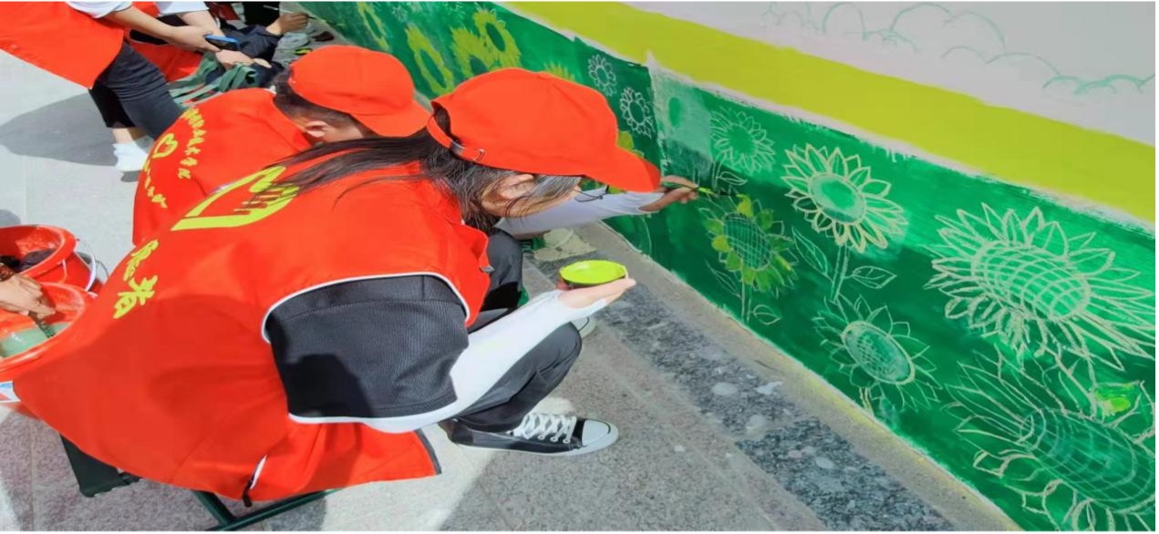 在传媒学院各民族志愿者们的共同努力下,完成了大部分墙绘作品,原本斑驳单调的墙面也变得绚丽丰富起来。白墙上是绿油油的草地,像极了巴州的广阔草原,而一片片向阳而生的向日葵却像生活在这的各个民族,他们朝气蓬勃,奋发向上,团结友爱,互帮互助。志愿者们的脸上也洋溢着满足的笑容。此次志愿服务彩绘活动中处处充满了欢声笑语,各民族同学们积极参与讨论,协力完成如此精彩的墙绘,也在其中切实感受到了“民族团结一家亲”的真正内涵。