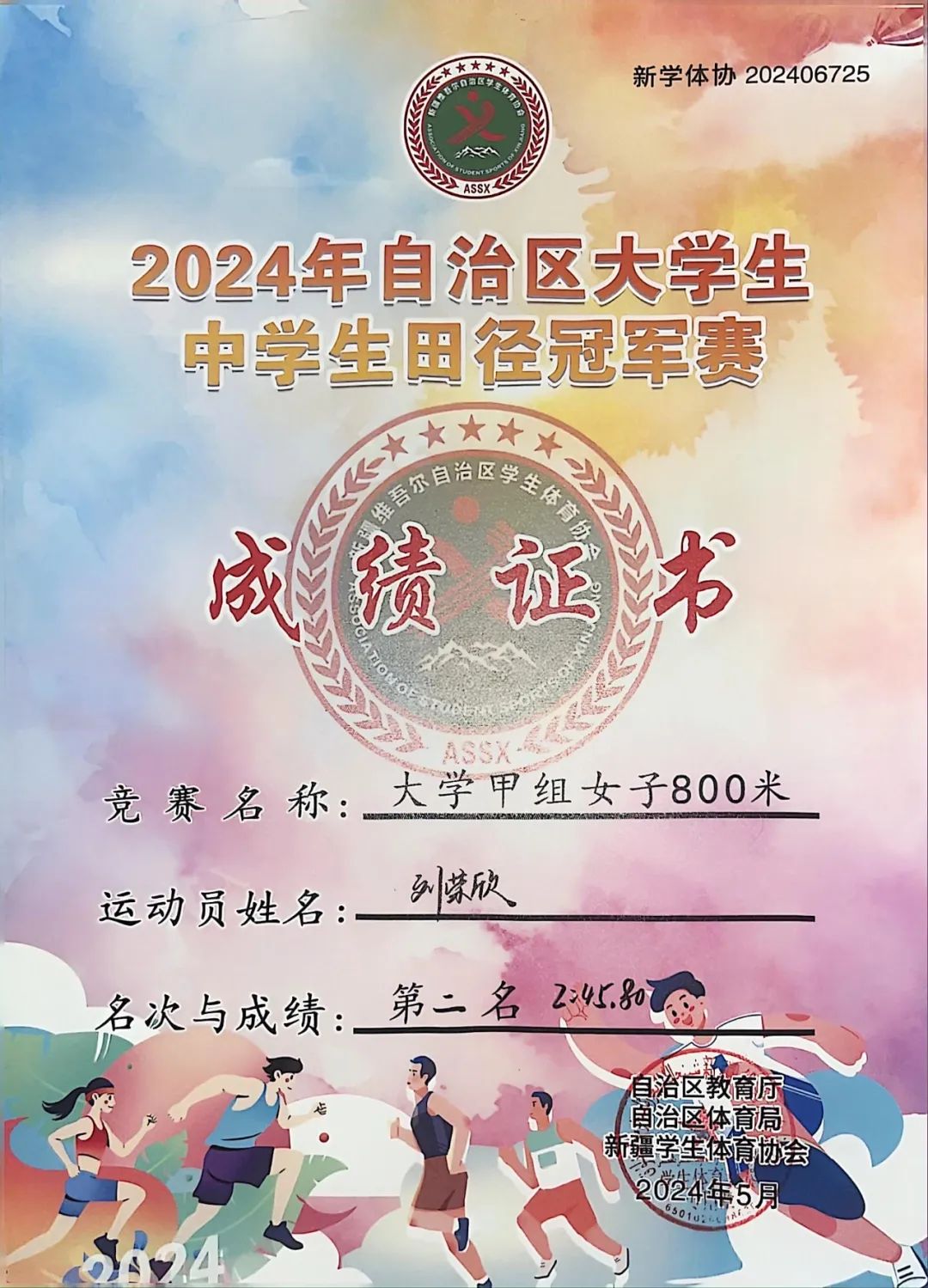 获奖感言:通过这次比赛,我深刻体会到了努力与团队的价值。优秀运动员来之不易,不仅磨砺了我的体能也锻造了我坚韧不拔的意志。同时,也让我见证了体育竞技不仅仅是个人的荣耀,更是集体力量!在我跑800米精疲力尽的时候,队友们的加油鼓劲让我坚持到了最后;跑1500米想要放弃的时候也是我的教练以及队员们给予我加油、鼓励!展望未来,我会带着这份荣誉继续前行,不骄不躁,持之以恒。感谢支持我的教练和队友们,让我们一起期待更加辉煌的明天!