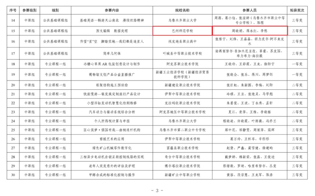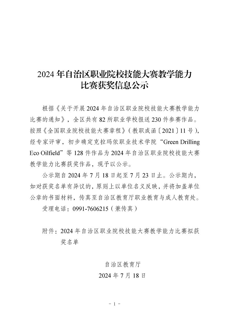 公示显示,全区共有82所职业学校报送230件参赛作品,经专家评审,初步确定克拉玛依职业技术学院“Green Drilling Eco Oilfield”等128件作品为2024年自治区职业院校技能大赛教学能力比赛获奖作品。公示期自2024年7月18日起至7月23日止。具体内容如下: