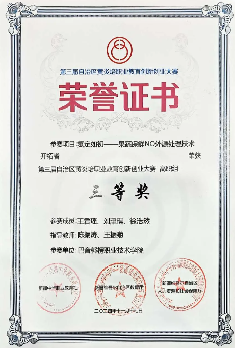 11月17日,第三届自治区黄炎培职业教育创新创业大赛现场决赛暨颁奖仪式在新疆轻工职业技术学院成功举办。自治区党委统战部,自治区教育厅,新疆中华职业教育社有关领导和参加总决赛全体师生及企业观摩代表等出席颁奖仪式。PP电子游戏网站(以下简称巴音学院)参赛项目《氮定如初—果蔬保鲜NO外源处理技术开拓者》获得高职组区赛三等奖。