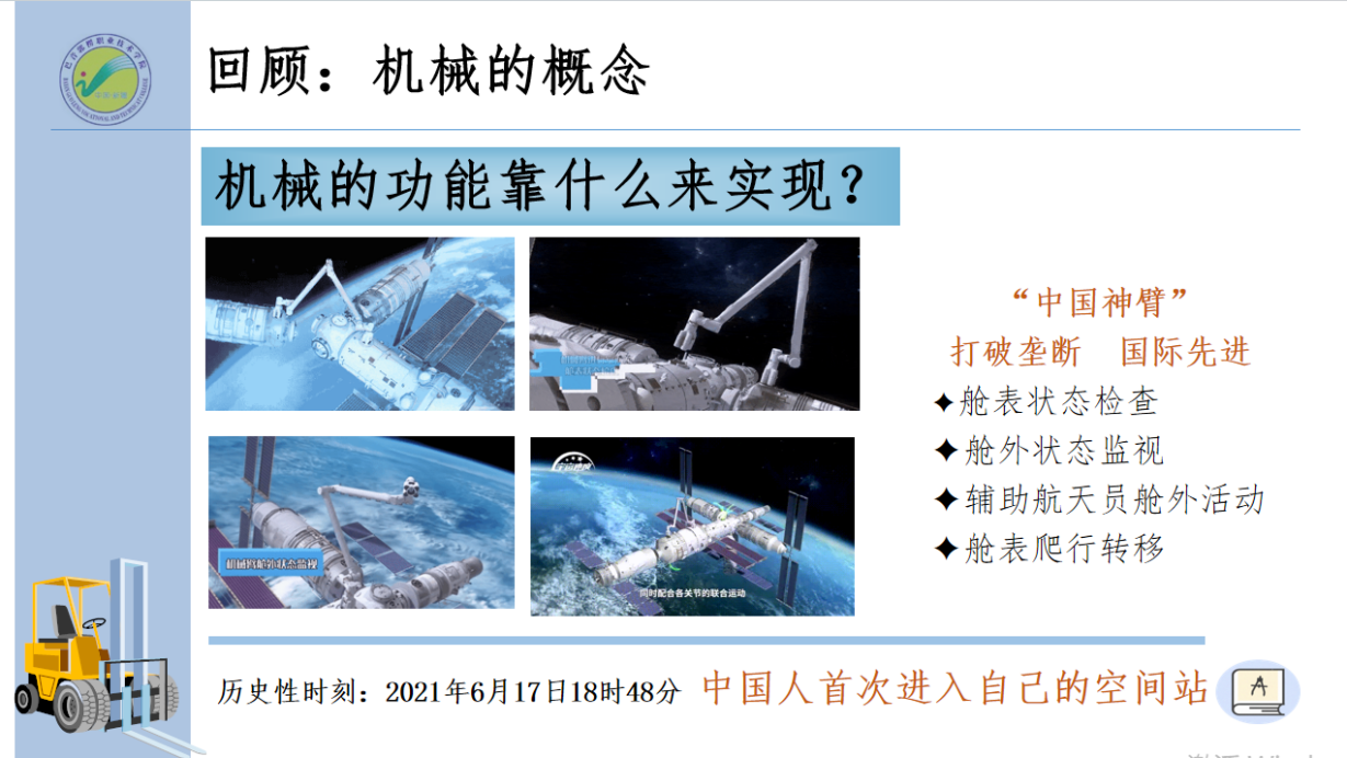 思政内容融入讲解: 近期最燃的一个历史性事件莫过于:2021年6月17日18时48分,中国人首次进入自己的空间站,和空间站共同亮相的是一个印有五星红旗及中国载人航天标志的机械臂。 这个堪比“变形金刚”的“大力神臂”一亮相便惊艳了众多海外网友,7自由度机械臂让中国空间站如虎添翼。它是我国目前智能程度最高、规模与技术难度最大、系统最复杂的空间智能制造系统,是经过14年研发打破西方垄断,技术领先全世界的“中国神臂”。机械臂需完成舱表状态检查,舱外状态监视,辅助航天员舱外活动和舱表爬行转移四项主要功能,从动图我们不难看出,机械臂的这些功能要依靠——机械运动来实现。 实现机械运动和动力传递的载体,我们称作“机构”。一些常见机构在我们的生活和学习中并不陌生,比如说机械臂中常见的连杆机构,减速箱中常见的齿轮机构,自行车中常见的链传动机构,等等。 三、课后 借助雨课堂平台发布作业和拓展学习资源,学生自主探究,进行知识巩固和拓展,借助微信群、钉钉群进行交流,答疑解惑。教师同时充当学生的心灵导师,帮助学生解答困惑、疏导心理、讨论社会热点,传递正能量,与学生亦师亦友,做学生的良师益友。