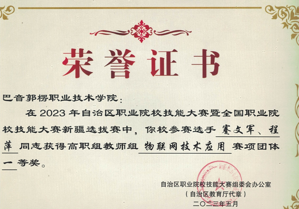 5 电子信息工程技术专业教师取得2023年自治区技能大赛教师组“物联网技术应用”赛项一等奖荣誉证书