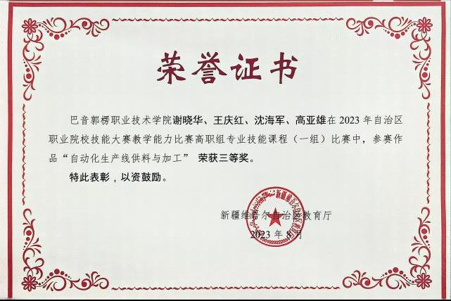 (1)师资队伍:拥有一支专兼结合、结构合理、经验丰富的教学团队,团队成员8人,其中硕士研究生学历4人,副教授1人,电工高级技师1人,电工技师2人,机械制造工长技师1人,企业兼职教师2人。该团队在2022年、2023年连续两年获得自治区职业院校教学能力比赛高职组专业技能一组三等奖,2024年自治区技能大赛“工业机器人系统集成”项目获教师组三等奖。指导学生参加各级各类技能大赛中获得多项荣誉,2023年自治区技能大赛“工业机器人系统集成”项目获学生组二等奖1项,2023一带一路金砖国家技能发展与技术创新大赛第四届工业机器人装调维修技术赛项获二等奖1项,三等奖1项。