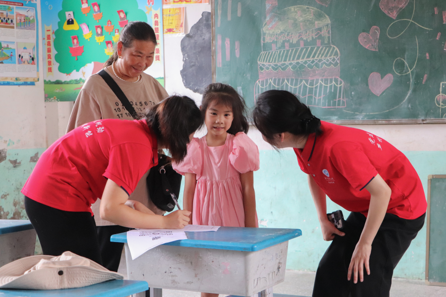 上午八点左右,孩子们在家长的陪同下陆陆续续来到了学校,这些孩子大多数都是留守儿童,很多都是由爷爷奶奶带着来参加活动。教学组的志愿者们热情周到的接待来校学生和家长,他们跟家长们互加联系方式、建立家长群、仔细地介绍课程事项,在孩子们自己动手填写完支教课程报名表后,快乐的情绪从他们稚嫩的脸上渗透而出,与照在他们脸上的阳光混合在一起,在阳光下熠熠生辉。