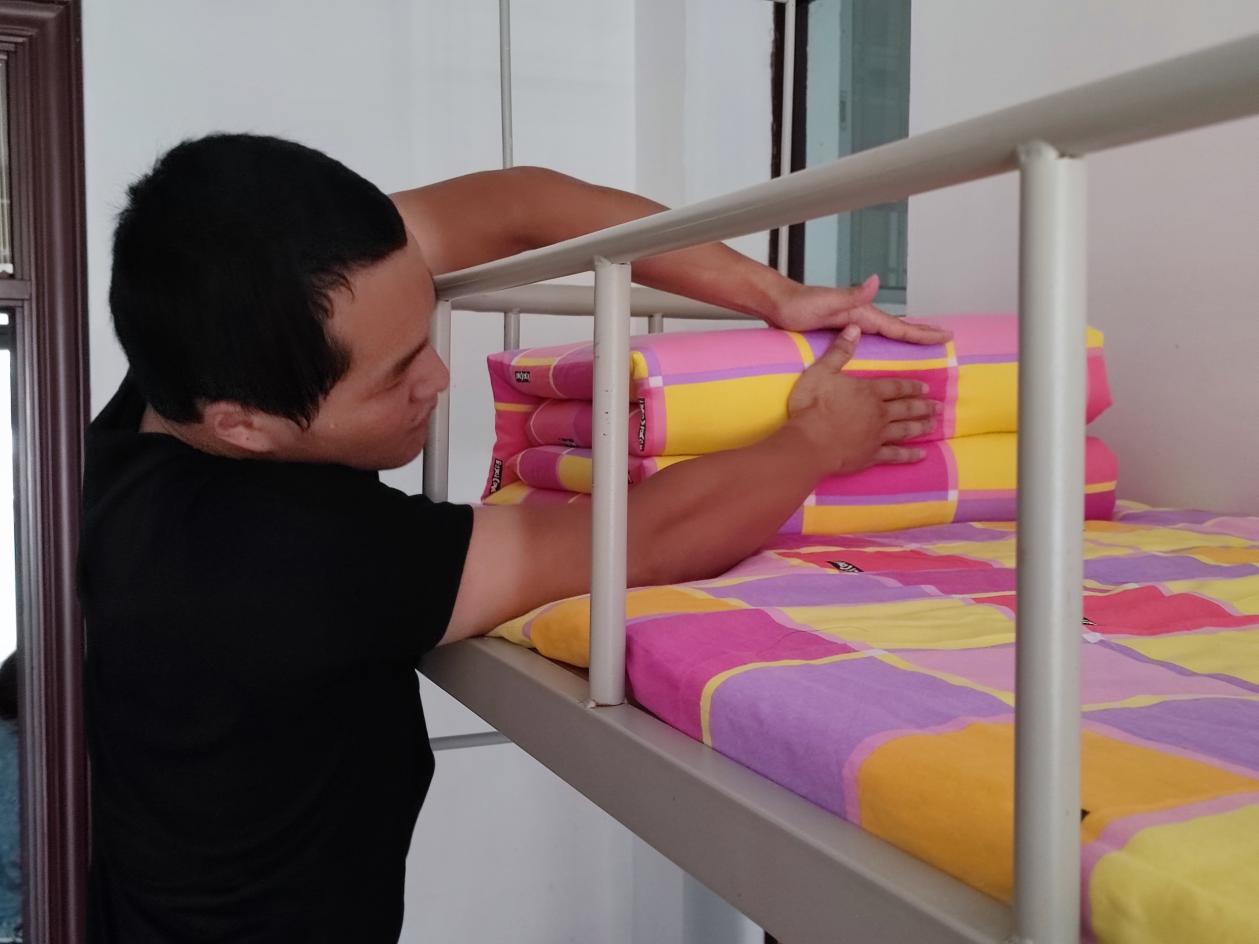 “出门看队伍,进门看内务”,内务整理作为军训必修课之一。退役军人们仔细向新生们介绍内务标准并亲自示范,短短几分钟退役军人们将书籍归类做到整整齐齐、鞋子衣物做到各有归处、被子一捋做到四四方方,把杂乱狭小的宿舍整理得整齐宽敞。永利集团88304官网退伍军人杨鹏志说道:“走出军营,重返校园,脱下军装,我时刻以军人的标准严格要求自己。希望新生们能学习军人的意志品格,脚踏实地,时刻严格要求自我。”