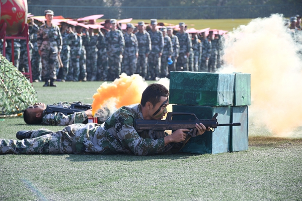 分列式表演结束后,四面鼓声有节奏的响起,主席台上一名教官摇着一面红旗发出开始的号令,本次军训汇演最大的亮点拳术表演以及战术表演相继上演。永利官网200名新生和其他学院200名新生共同组成的400人拳术队站在田径场正中间,挥出拳头,迈开步伐,开始了军体拳表演。拳如风、步如松,他们动作刚劲、拳脚有力、气势十足、口号浑厚响亮,一套军体拳打出了军人的气势,磅礴的架势。随着豪迈的音乐响起,烟雾弹的烟雾笼罩着田径场中部,一场由军训团教官带来的战术表演在田径场中激烈进行着,战术表演模拟了战场实景、进攻战术与战场救护等科目,现场掌声欢呼声不绝于耳。