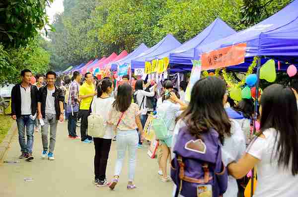 10月12日,我校一年一度的百团招新在电信路口至八教道路举行,全校129个社团集体亮相,其中隶属于永利官网的12个社团在此招才纳新。整齐划一的深蓝帐篷、五彩缤纷的海报、拿着喇叭高声介绍的社团成员和带着兴奋好奇目光四处张望的新生构成了火爆的百团招新场面。各个社团使出浑身解数,吸引新生的加入。
