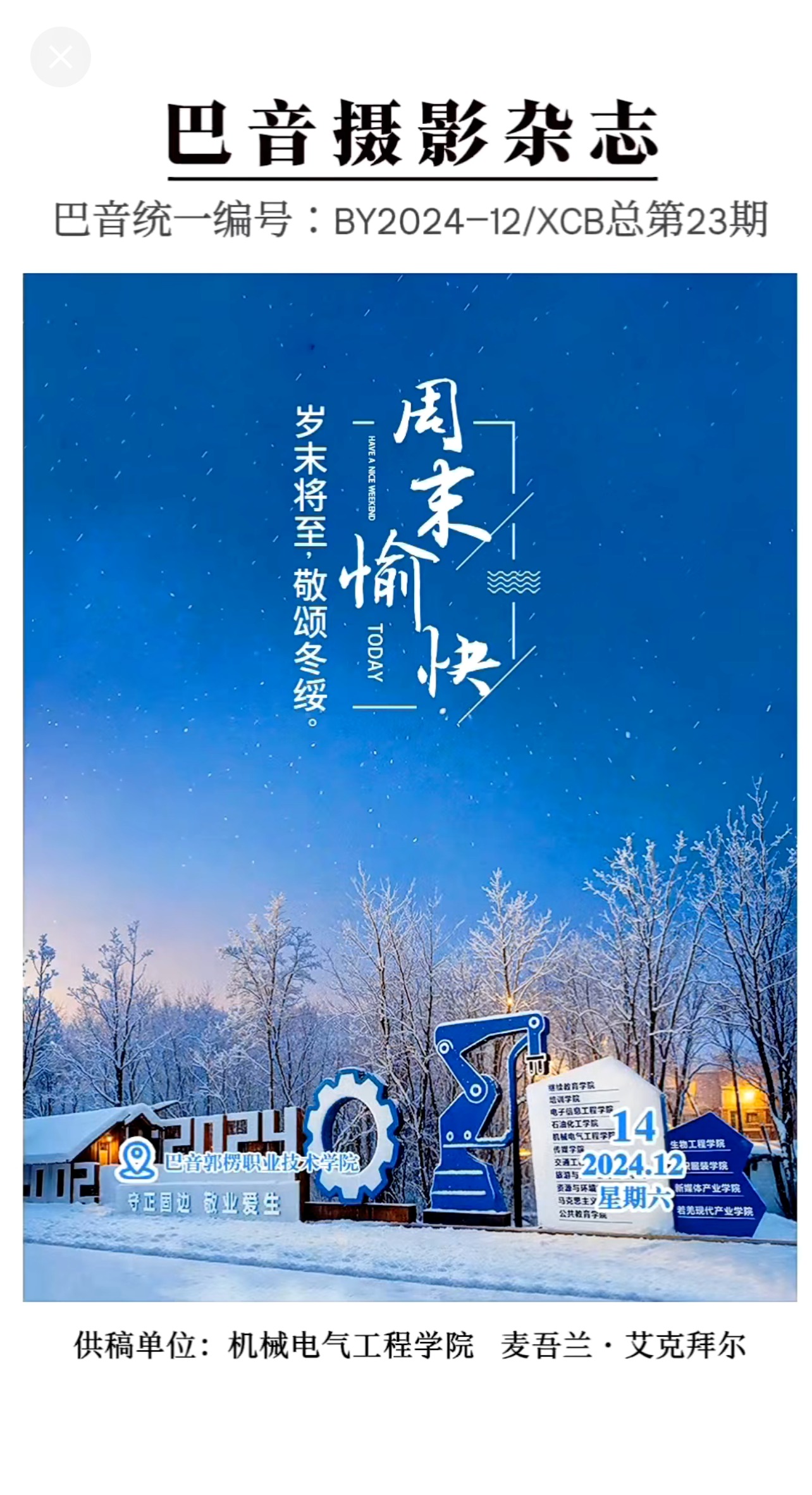 巴音摄影杂志统一编号:BY2024−12/XCB总第23期。“周末愉快...